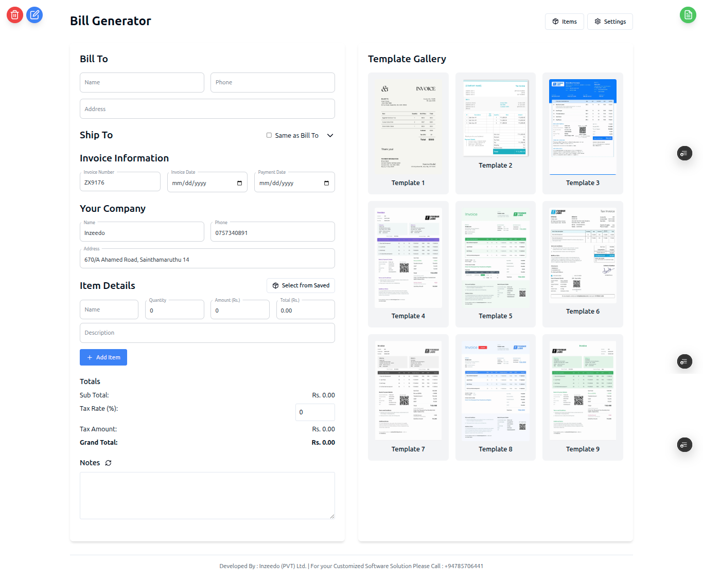 Generate invoices with multiple templates, PDF export, and customer records management.